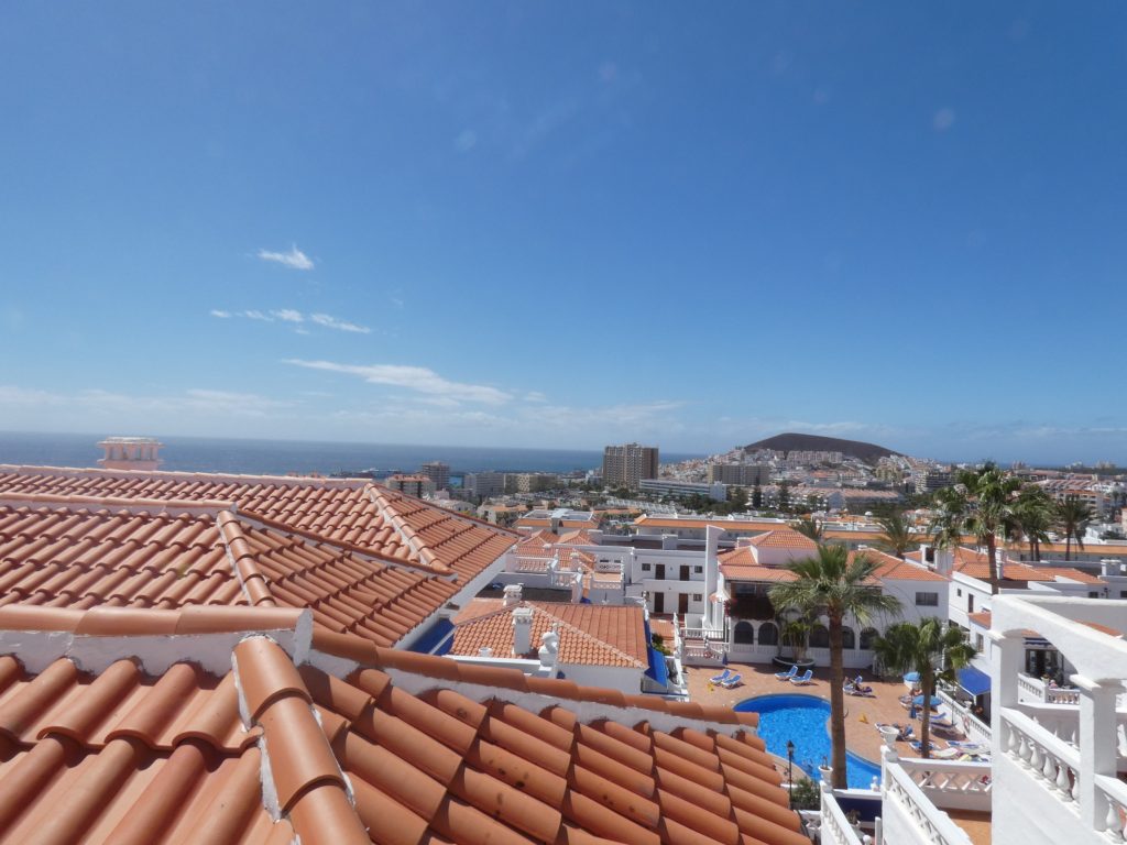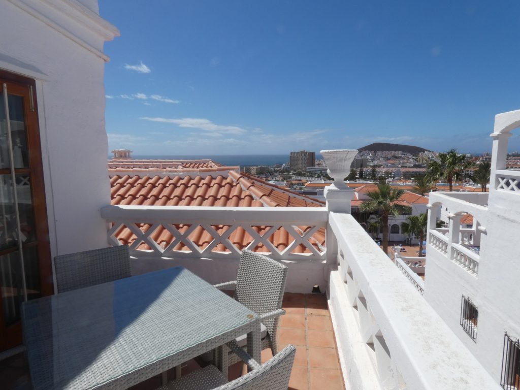 The balcony has a sea view and is furnished with a table and 4 chairs.